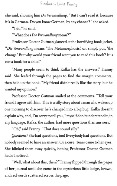 My novel takes place in the 1950’s in Pittsburgh, during the worst polio epidemics of that era. Franny, the main character contracts the disease and can no longer walk. During her hospital stay she is introduced to the recently published Charlotte’s Web by E.B. White, and falls in love with the book, and, especially, the spider, Charlotte. She longs for a Charlotte of her own. Her wish is granted in the form of the brilliant and hilarious Fleabrain, her dog’s flea. Fleabrain mentions that he's read Kafka's Metamorphosis, a book on her parents' bookshelf. Franny seeks out the book,Visit Joanne Rocklin's website.discovering that other readers have loved the story, writing comments such as "Kafka has the answers" in its margins. On page 69 [inset left; click to enlarge] she asks Professor Gutman, a scientist working in Jonas Salk's lab, to help her translate it.